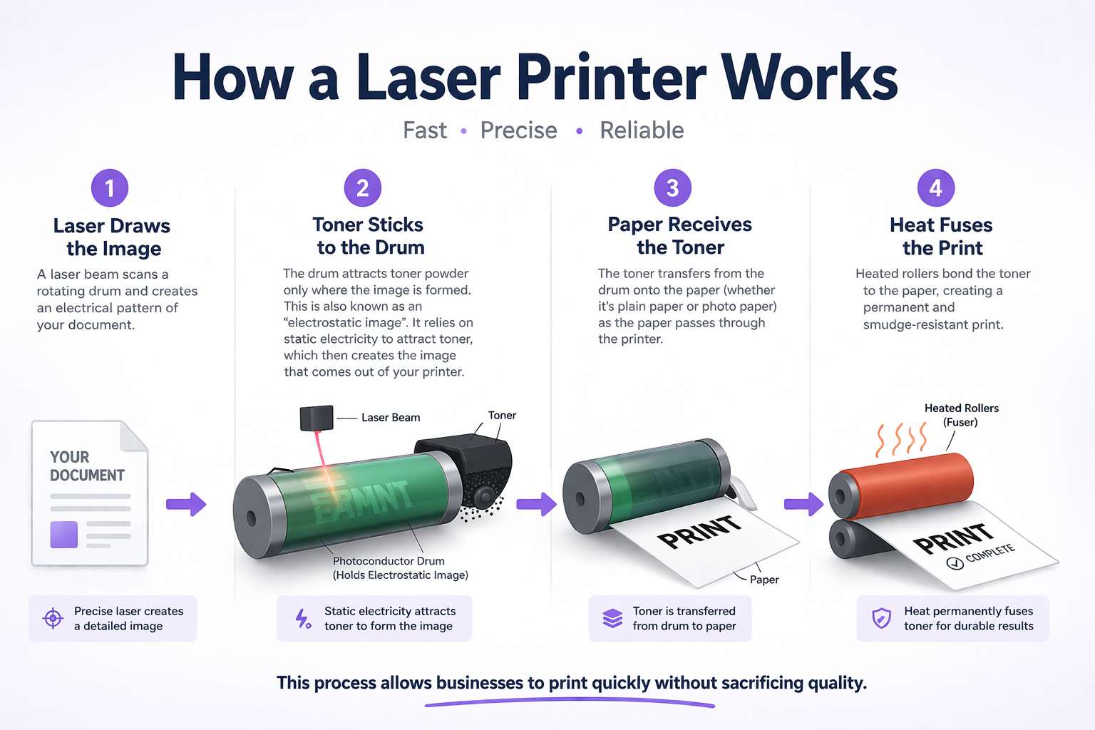 - Heat fuses the print Heated rollers bond the toner to the paper, creating a permanent and smudge-resistant print.